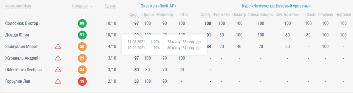 Интерфейс сводной таблицы с результатами сдачи тестов и экзаменов