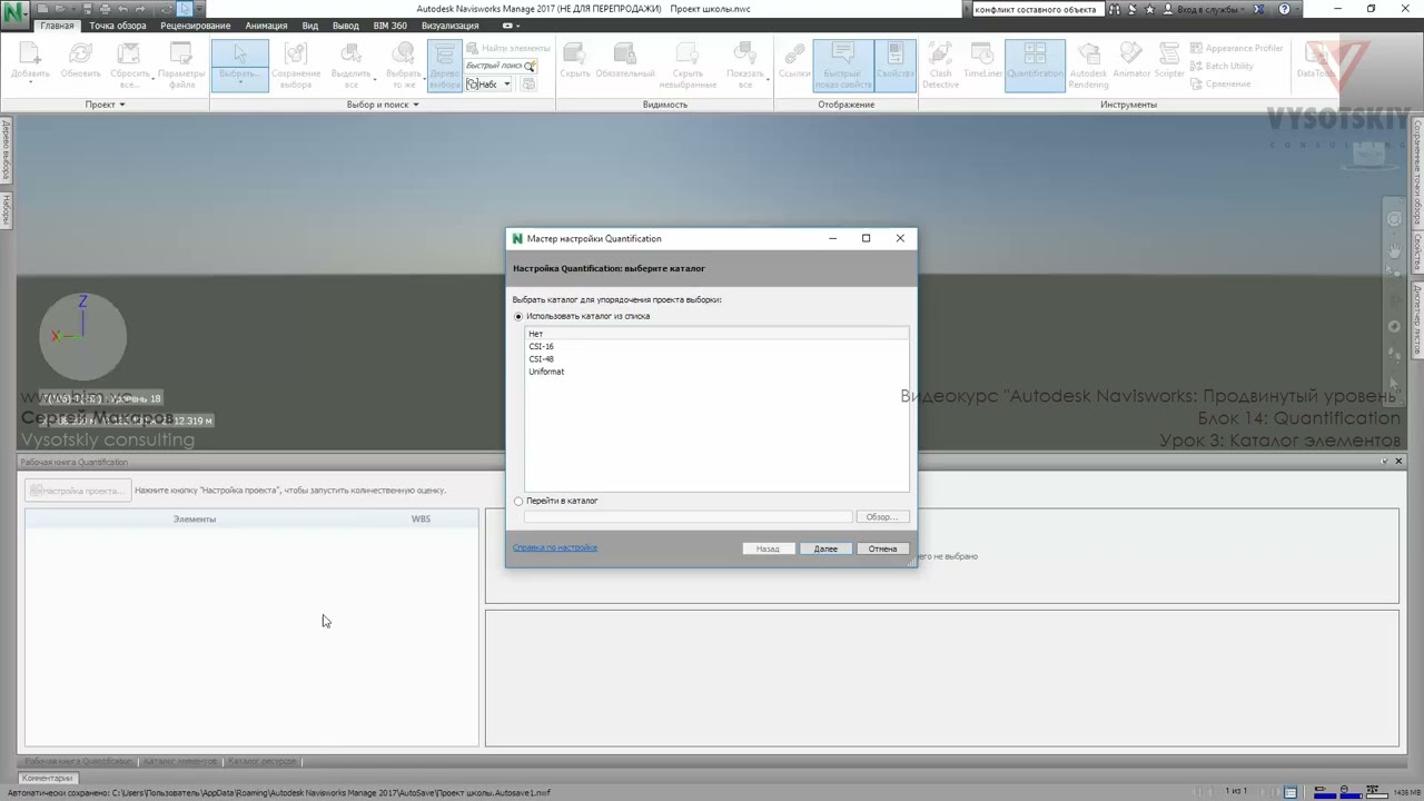 Проект модуля Quantification состоит из рабочей книги, каталога элементов и каталога ресурсов. Каталог элементов нужен для создания полей в рабочей книге. Каталог ресурсов определяет классификацию проекта.