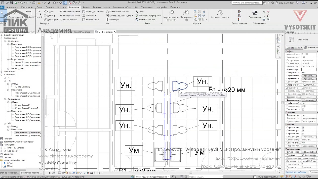 Продвинутый курс по построению трубопроводных систем разделов ОВ и ВК в Revit на основе архитектурной модели. Рассматриваются основные настройки программы, моделирование систем, а также формирование документации и спецификаций.