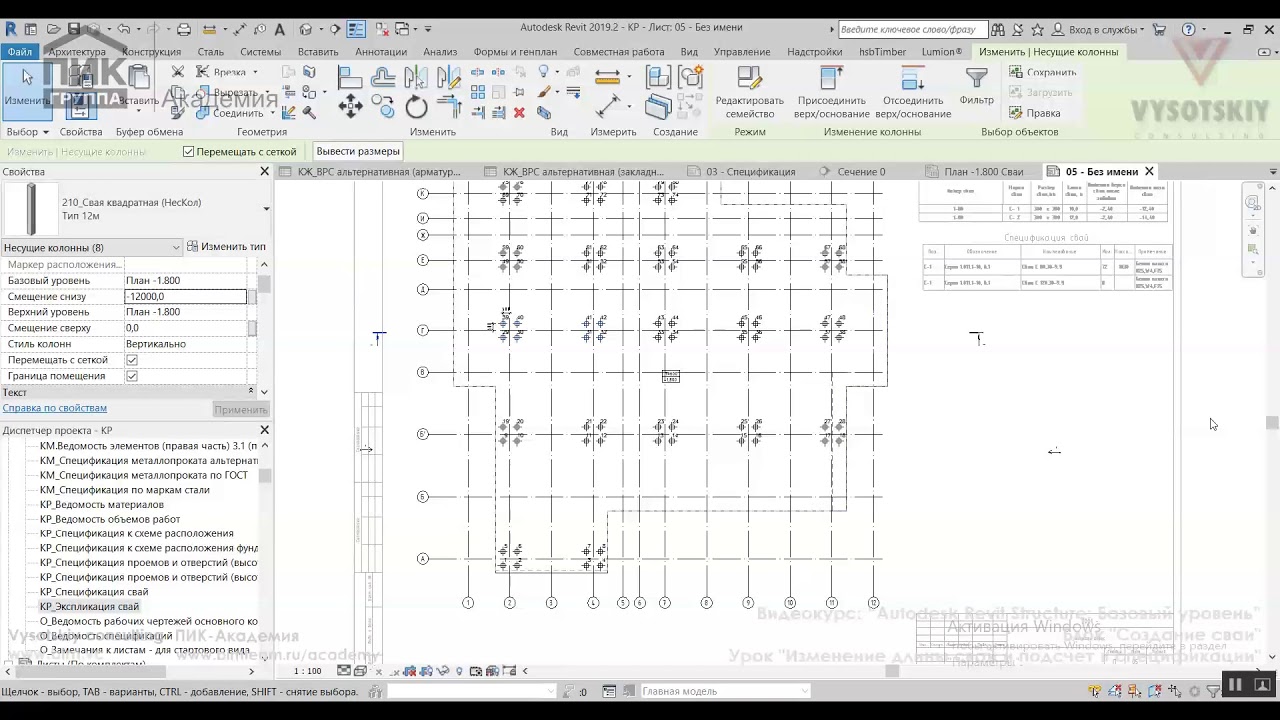 Изменение длины свай и подсчет в спецификации
