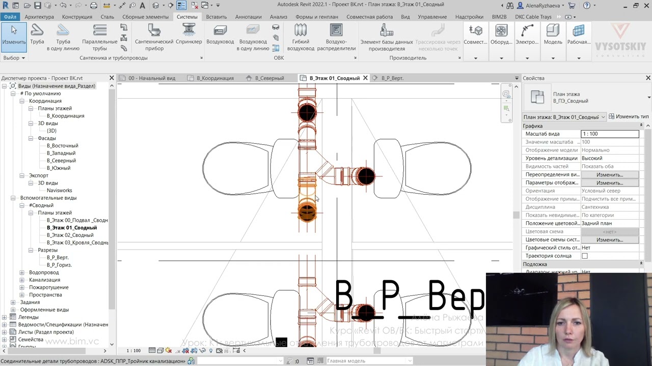 В ходе видеокурса мы рассмотрим процесс проектирования от начала создания проекта с настройкой связей с файлами архитектуры (выполненной непосредственно с помощью связок файлов Revit, а также с использованием подложек AutoCAD), научимся создавать рабочие виды (планы, 3D-виды, схемы) и управлять их видимостью с использованием шаблонов видов, а также создадим спецификации и оформим проектную документацию.