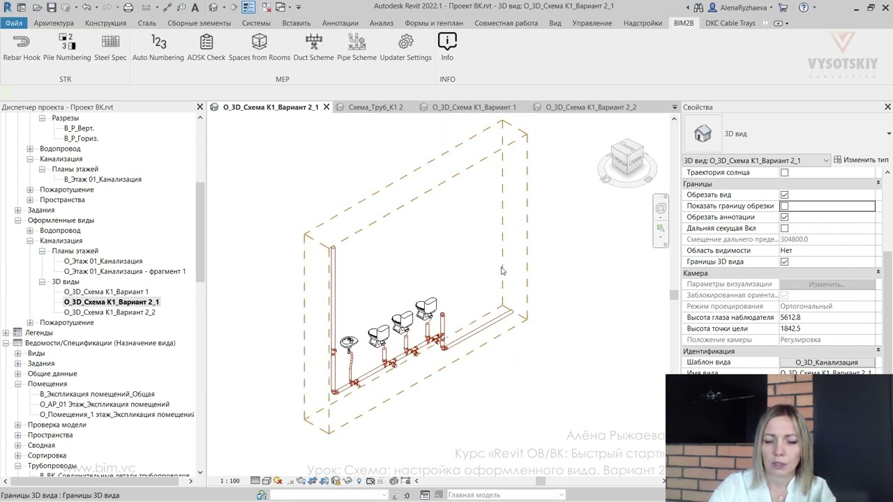 В ходе видеокурса мы рассмотрим процесс проектирования от начала создания проекта с настройкой связей с файлами архитектуры (выполненной непосредственно с помощью связок файлов Revit, а также с использованием подложек AutoCAD), научимся создавать рабочие виды (планы, 3D-виды, схемы) и управлять их видимостью с использованием шаблонов видов, а также создадим спецификации и оформим проектную документацию.