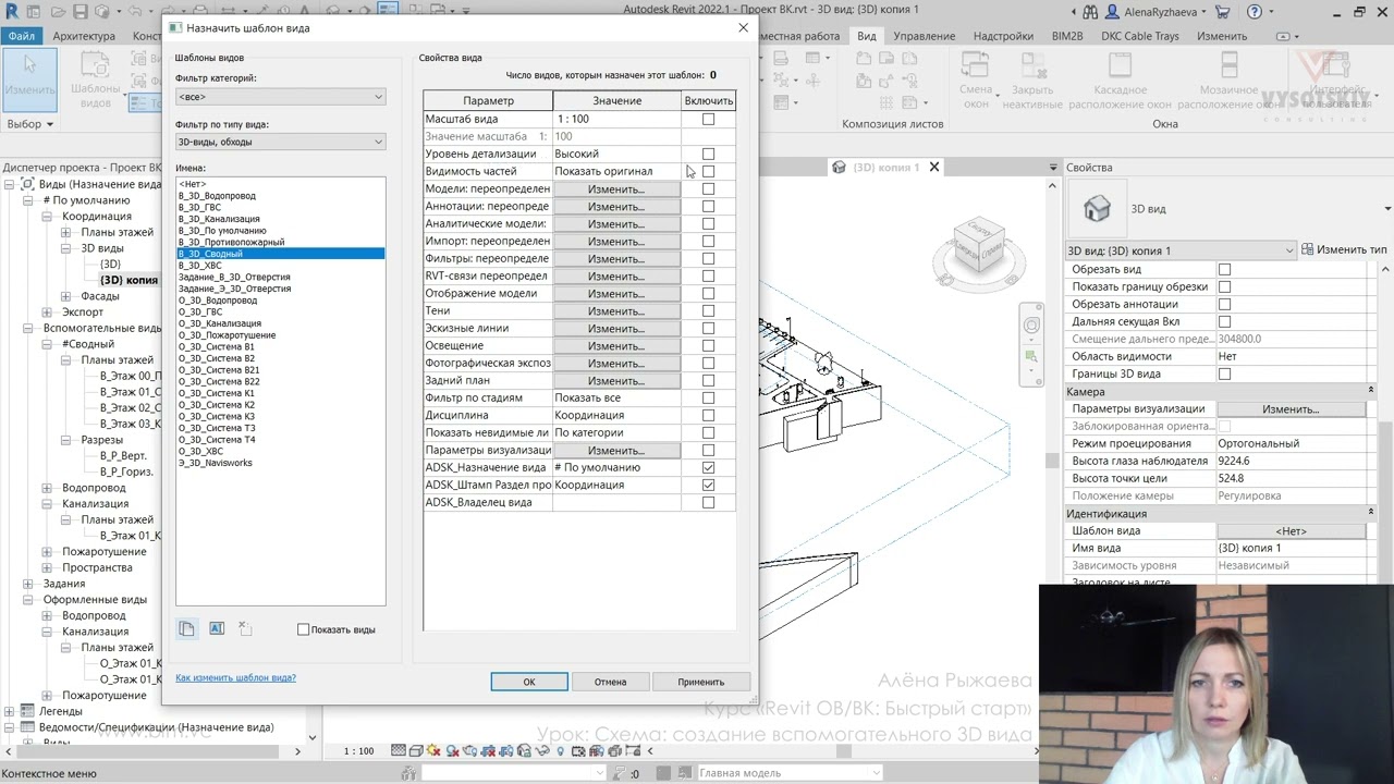 В ходе видеокурса мы рассмотрим процесс проектирования от начала создания проекта с настройкой связей с файлами архитектуры (выполненной непосредственно с помощью связок файлов Revit, а также с использованием подложек AutoCAD), научимся создавать рабочие виды (планы, 3D-виды, схемы) и управлять их видимостью с использованием шаблонов видов, а также создадим спецификации и оформим проектную документацию.