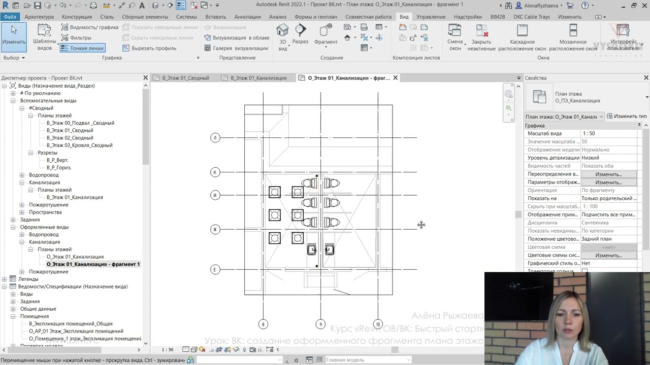 В ходе видеокурса мы рассмотрим процесс проектирования от начала создания проекта с настройкой связей с файлами архитектуры (выполненной непосредственно с помощью связок файлов Revit, а также с использованием подложек AutoCAD), научимся создавать рабочие виды (планы, 3D-виды, схемы) и управлять их видимостью с использованием шаблонов видов, а также создадим спецификации и оформим проектную документацию.