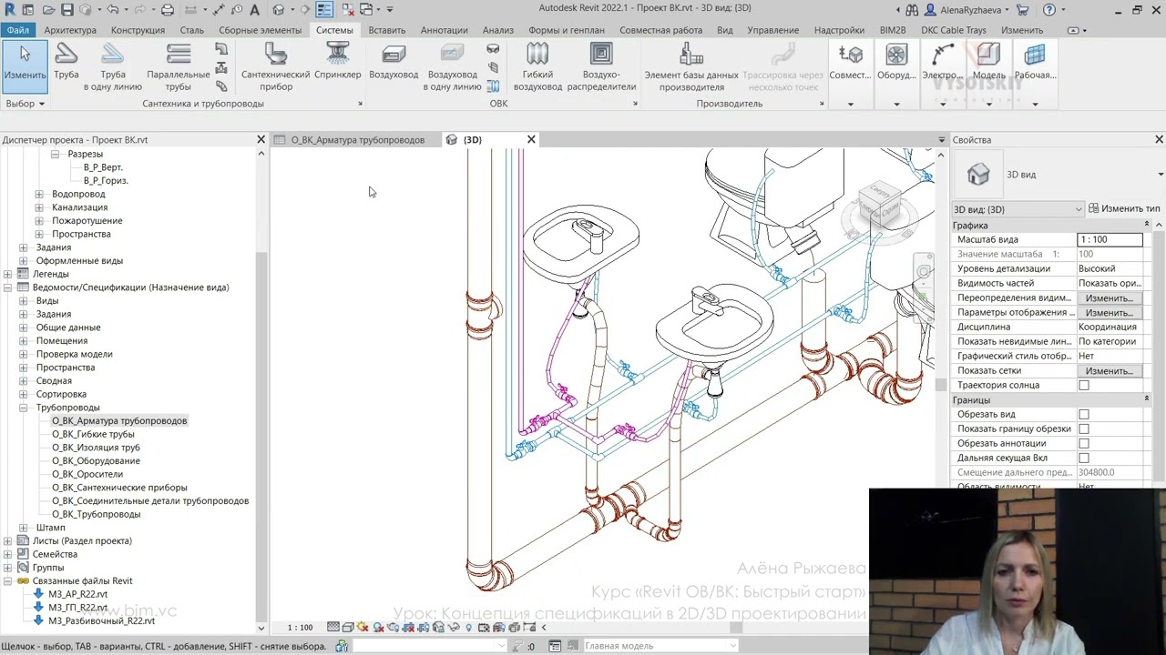 В ходе видеокурса мы рассмотрим процесс проектирования от начала создания проекта с настройкой связей с файлами архитектуры (выполненной непосредственно с помощью связок файлов Revit, а также с использованием подложек AutoCAD), научимся создавать рабочие виды (планы, 3D-виды, схемы) и управлять их видимостью с использованием шаблонов видов, а также создадим спецификации и оформим проектную документацию.