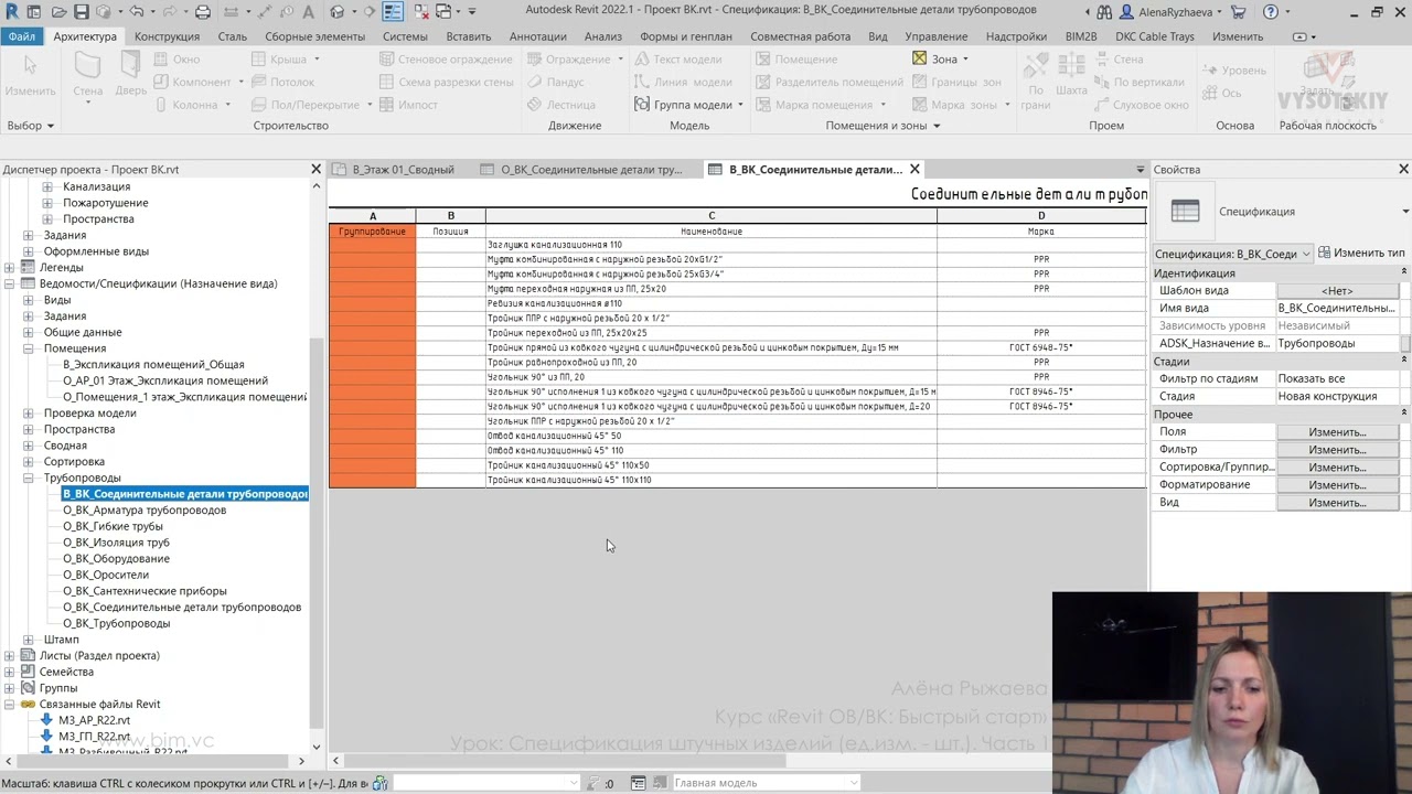 В ходе видеокурса мы рассмотрим процесс проектирования от начала создания проекта с настройкой связей с файлами архитектуры (выполненной непосредственно с помощью связок файлов Revit, а также с использованием подложек AutoCAD), научимся создавать рабочие виды (планы, 3D-виды, схемы) и управлять их видимостью с использованием шаблонов видов, а также создадим спецификации и оформим проектную документацию.