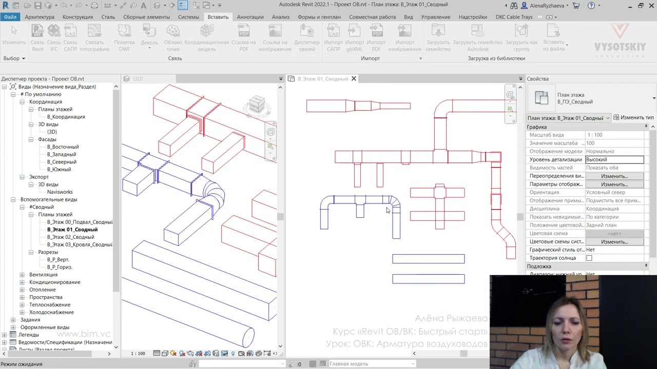 В ходе видеокурса мы рассмотрим процесс проектирования от начала создания проекта с настройкой связей с файлами архитектуры (выполненной непосредственно с помощью связок файлов Revit, а также с использованием подложек AutoCAD), научимся создавать рабочие виды (планы, 3D-виды, схемы) и управлять их видимостью с использованием шаблонов видов, а также создадим спецификации и оформим проектную документацию.