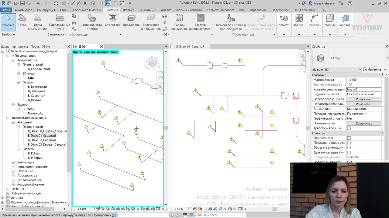 В ходе видеокурса мы рассмотрим процесс проектирования от начала создания проекта с настройкой связей с файлами архитектуры (выполненной непосредственно с помощью связок файлов Revit, а также с использованием подложек AutoCAD), научимся создавать рабочие виды (планы, 3D-виды, схемы) и управлять их видимостью с использованием шаблонов видов, а также создадим спецификации и оформим проектную документацию.