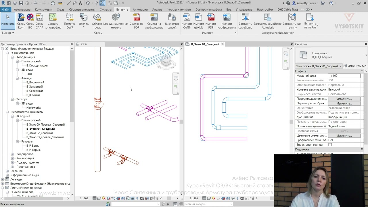 В ходе видеокурса мы рассмотрим процесс проектирования от начала создания проекта с настройкой связей с файлами архитектуры (выполненной непосредственно с помощью связок файлов Revit, а также с использованием подложек AutoCAD), научимся создавать рабочие виды (планы, 3D-виды, схемы) и управлять их видимостью с использованием шаблонов видов, а также создадим спецификации и оформим проектную документацию.
