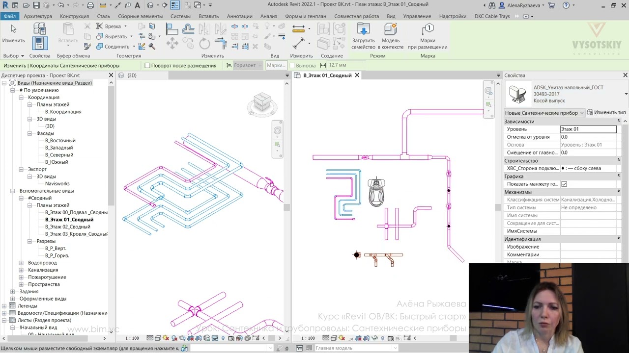 В ходе видеокурса мы рассмотрим процесс проектирования от начала создания проекта с настройкой связей с файлами архитектуры (выполненной непосредственно с помощью связок файлов Revit, а также с использованием подложек AutoCAD), научимся создавать рабочие виды (планы, 3D-виды, схемы) и управлять их видимостью с использованием шаблонов видов, а также создадим спецификации и оформим проектную документацию.