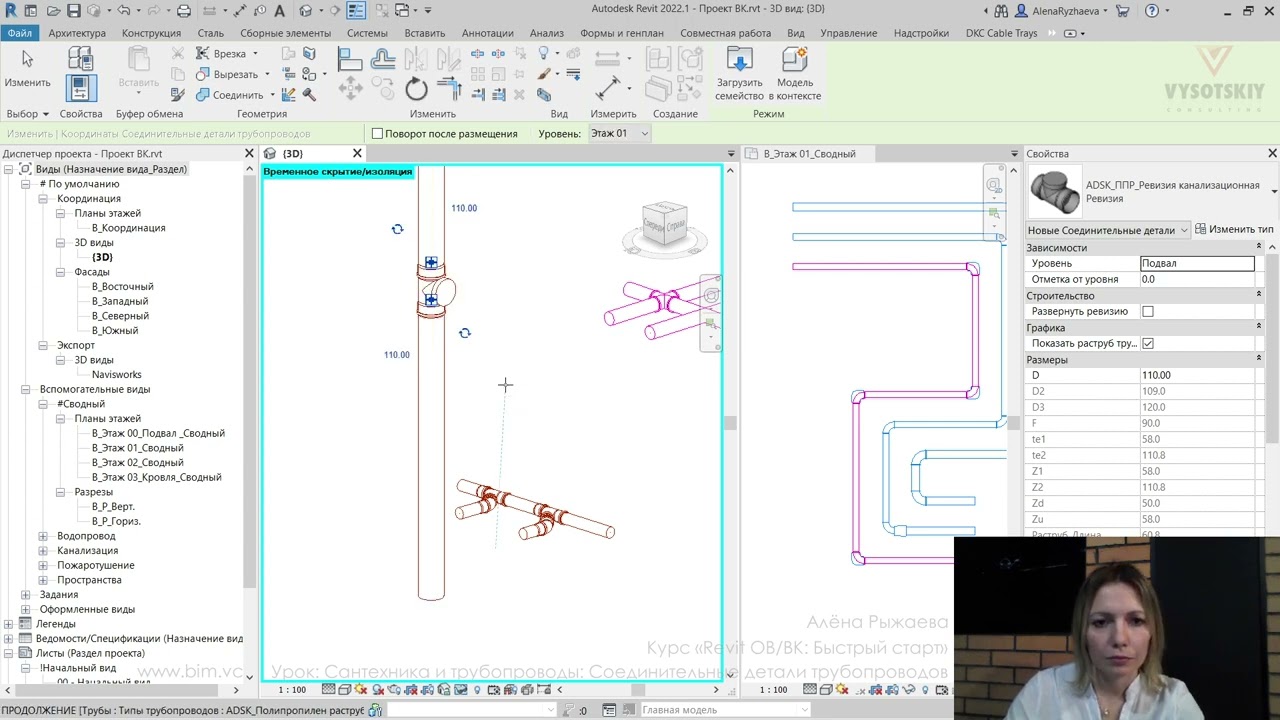В ходе видеокурса мы рассмотрим процесс проектирования от начала создания проекта с настройкой связей с файлами архитектуры (выполненной непосредственно с помощью связок файлов Revit, а также с использованием подложек AutoCAD), научимся создавать рабочие виды (планы, 3D-виды, схемы) и управлять их видимостью с использованием шаблонов видов, а также создадим спецификации и оформим проектную документацию.