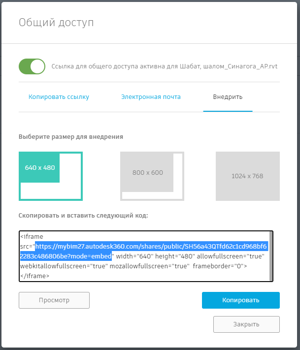 3. Предоставьте доступ к сборке по ссылке и вставьте эту ссылку в портфолио на bim.vc.