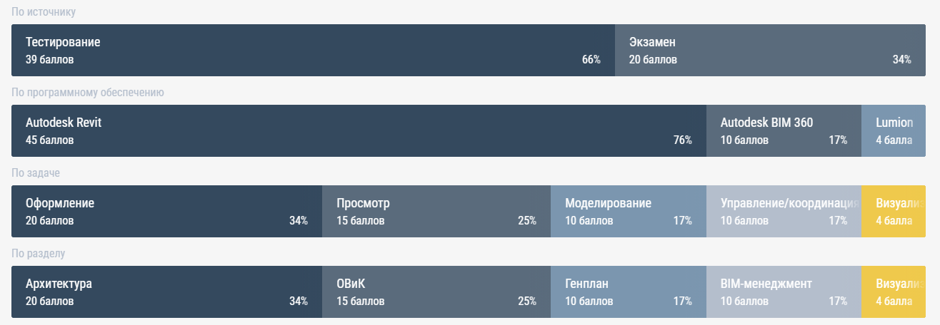 Тестирования помогут проверить знания во время обучения, а экзамены — инструмент для специалистов с опытом. Когда вы проходите тестирования и экзамены, то сайт распознает основные параметры и строит аналитику: в каком ПО вы сдавали проверки, по каким задачам и т.д.