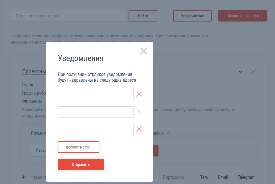 Теперь когда пользователи откликаются на вакансию вам придёт уведомление. Причем вы можете добавить адреса как сразу для всех вакансий (например, почту HR’а), так и задавать контакты индивидуально — подойдёт для уведомления руководителям отделов.Причем можно задать адреса сразу для всех вакансий (Вакансии → Уведомления), так и для конкретной вакансии (Вакансии → Войти в редактирование → Почта для отклика).