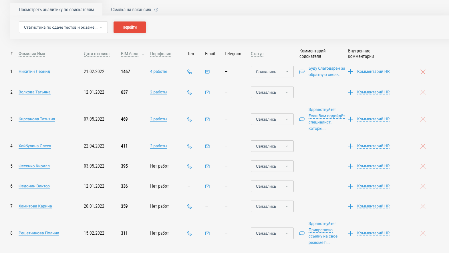 Теперь вы видите не только дату отклика и ссылку а профиль, но и общий BIM-балл пользователя (поможет отсортировать соискателей по «крутости»), число работ в портфолио, все контакты и, главное, статусы и комментарии. Благодаря статусам вы можете управлять продвижением пользователя по процессу трудоустройства. А комментарии помогут сохранить ключевые заметки в процессе работы.Спасибо Александру Головешкину (Дон-Строй) за данное предложение.
