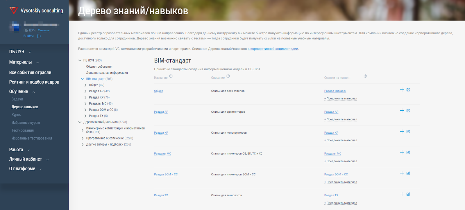 На платформе развернули корпоративное Дерево навыков ПБ «Луч»: настроили структуру, описали навыки, добавили ссылки на статьи из BIM-стандарта. Естественно, в системе акцент на безопасности: доступ к этому контенту — только у сотрудников компании.