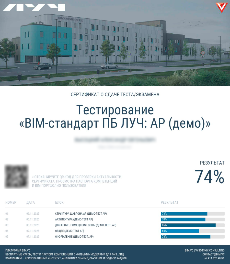Команда Vysotskiy consulting разработала и настроила корпоративное тестирование по BIM-стандарту ПБ «Луч»: от структуры Дерева навыков до готовых тестов и сертификатов на платформе.