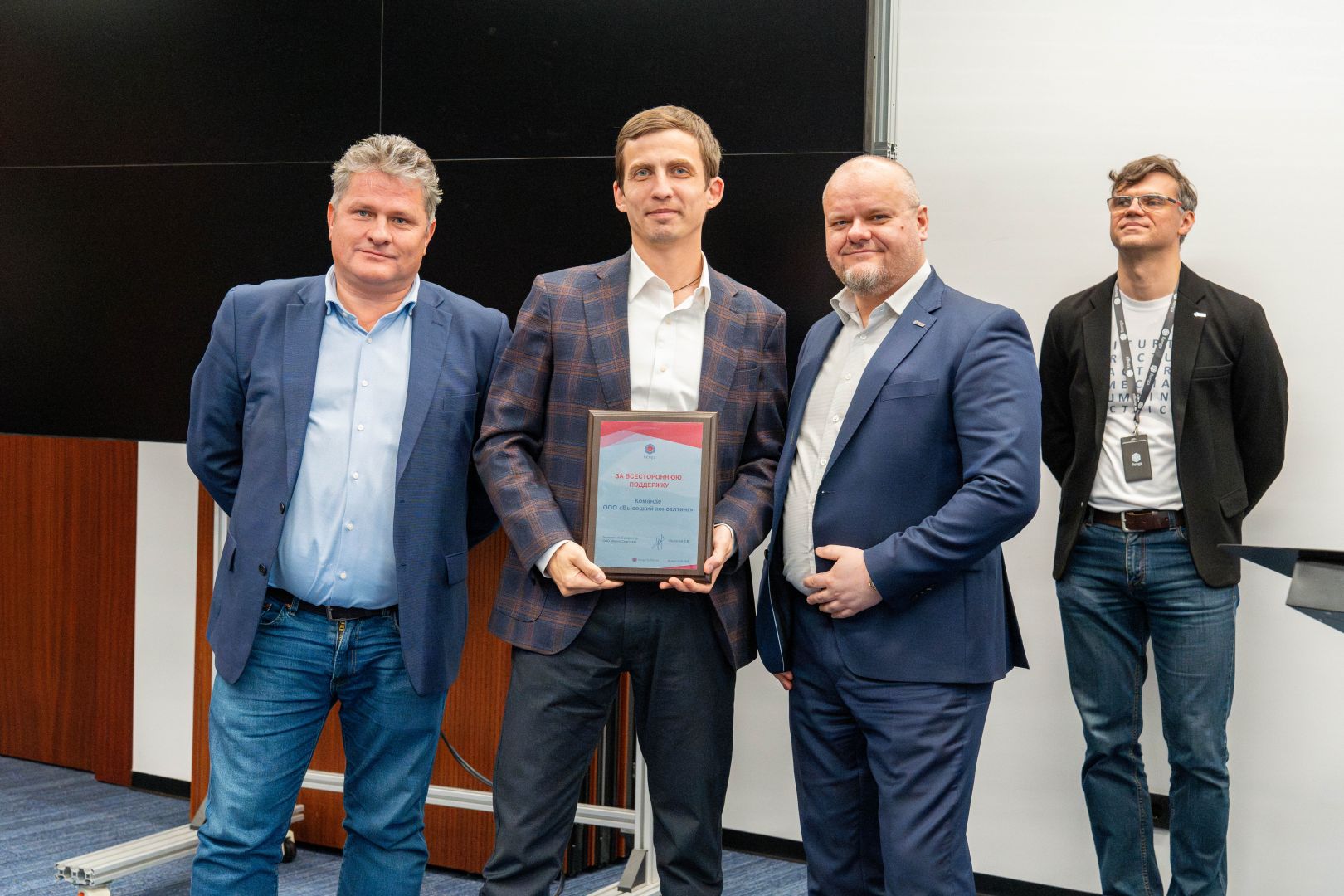 Максим Богданов, генеральный директор АСКОН, Евгений Шувалов, генеральный директор Renga Software и Максим Нечипоренко, заместитель директора Renga Software, вручают Александру Высоцкому, генеральному директору Vysotskiy consulting, благодарность за совместную работу.