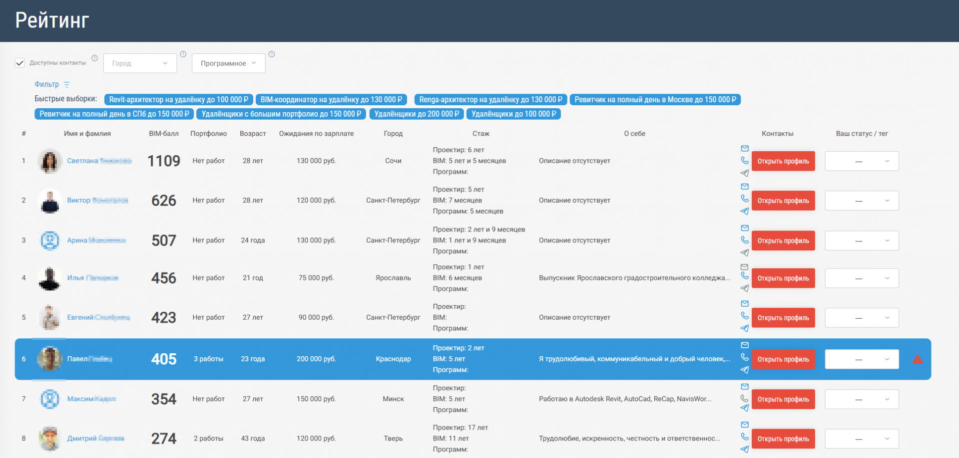 Рейтинг bim.vc — глобальный инструмент платформы, который продвинет активных пользователей, поможет сравнить себя с коллегами и найти работу в хорошей компании. А для компаний отличный инструмент быстрого подбора специалистов по заданным критериям.