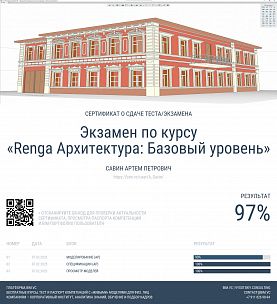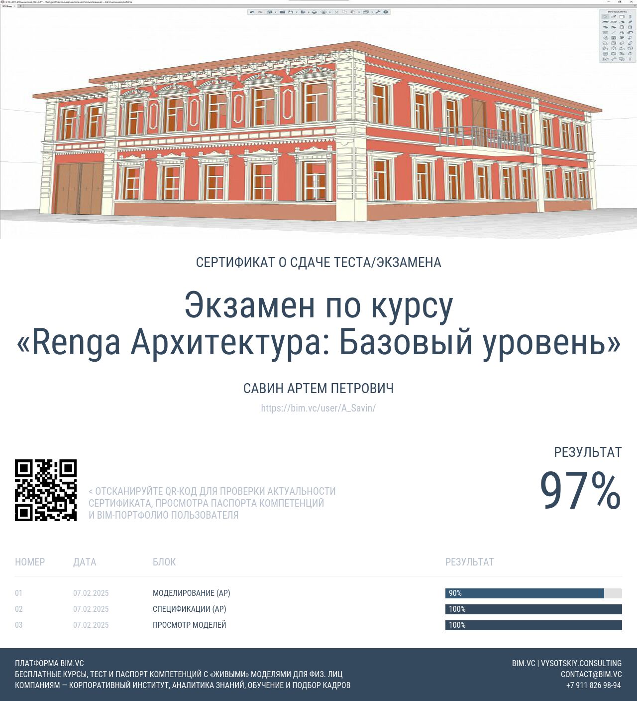 | Экзамен «Начинающий проектировщик в среде Renga — АР» | 97% | 07.02.2025 |