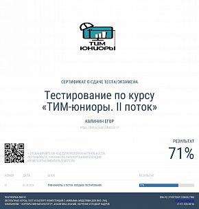 | ТИМ-юниоры. II поток. Входное тестирование | 71% | 06.08.2024 |