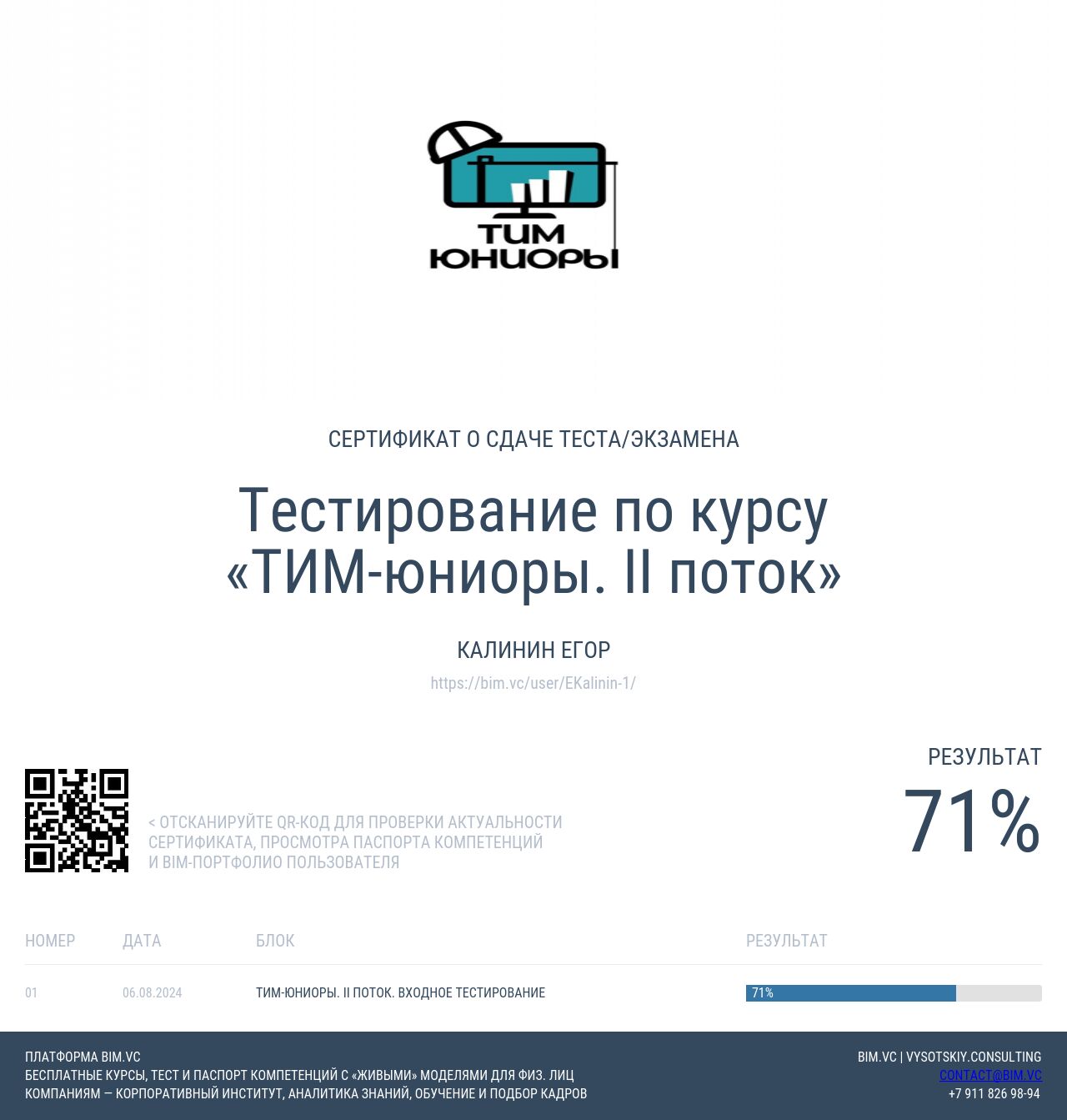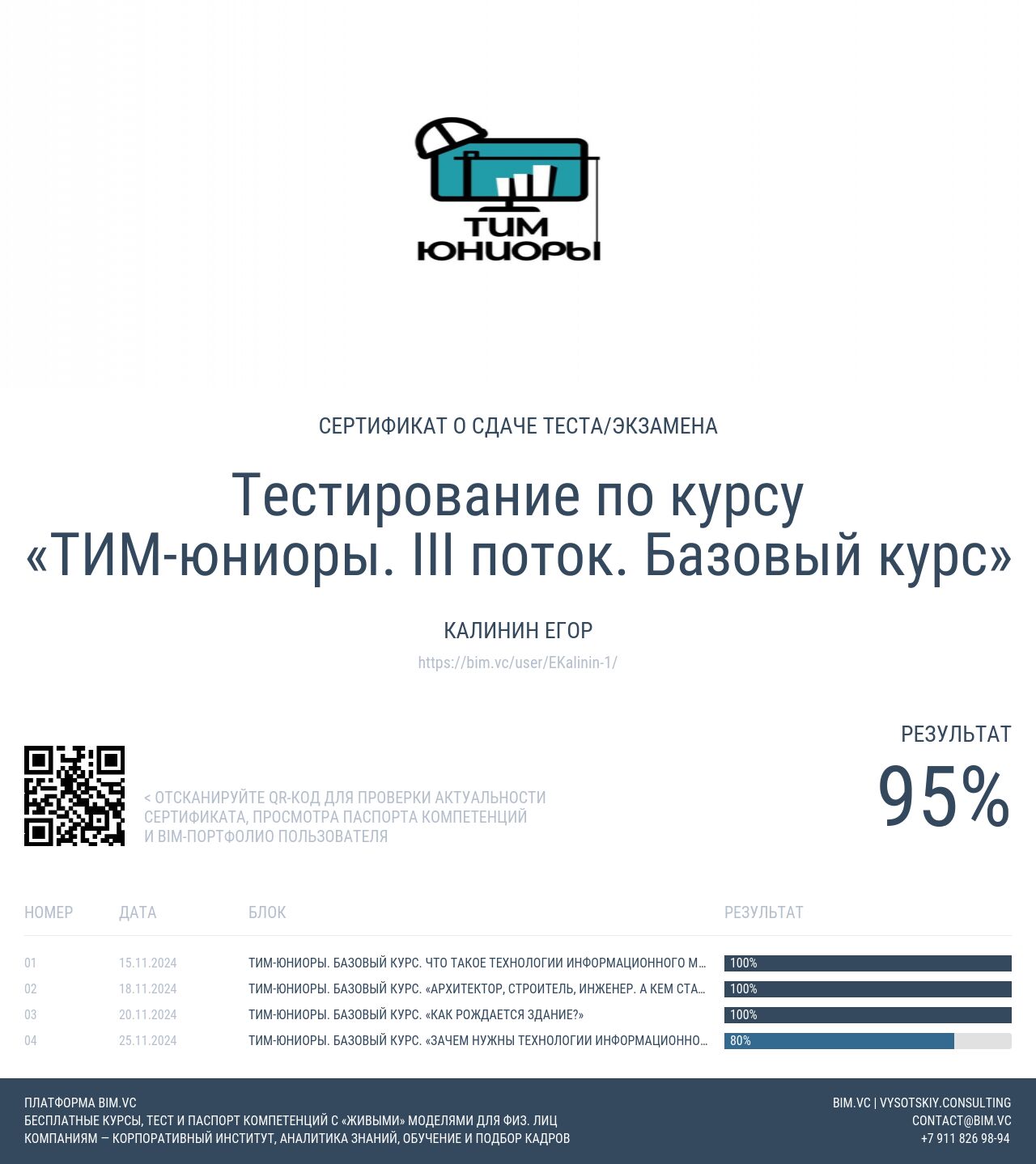 | ТИМ-юниоры. Базовый курс. «Зачем нужны технологии информационного моделирования в строительстве?» | 80% | 25.11.2024 |